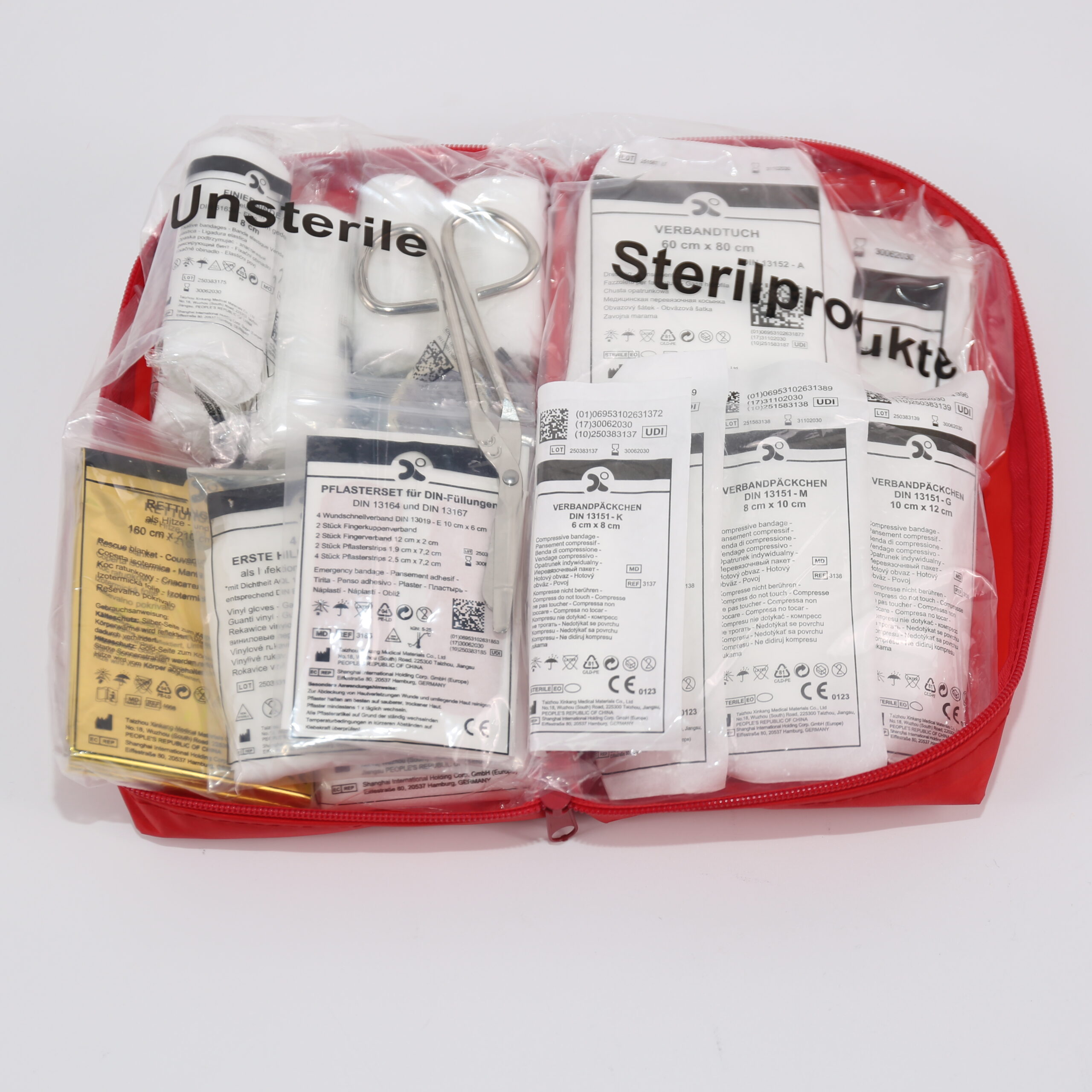 The DIN13164 First Aid Kit contains a curated selection of high-quality medical supplies necessary for tackling a wide range of emergencies. From sterile bandages to adhesive plasters, scissors, and gauze compresses, every item is chosen to aid in efficient and effective first aid administration. Additionally, the kit includes triangular bandages, latex gloves, and wound dressings to ensure comprehensive care when needed the most. Designed with organization in mind, each component is carefully arranged for quick access during critical moments.
