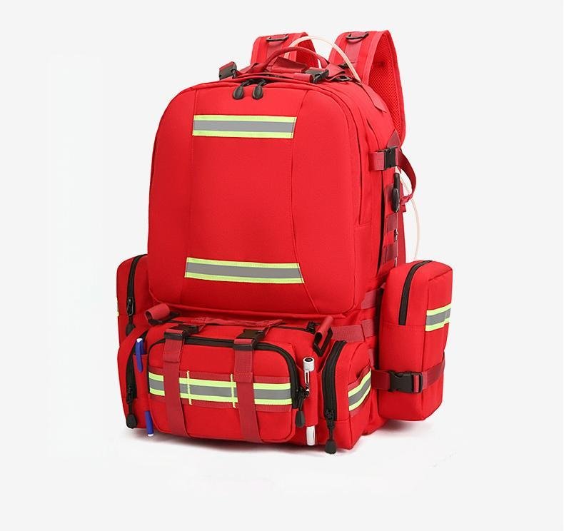 Featuring expandable side pouches (for quick-access gear), multiple organized compartments (for efficient supply sorting), and prominent reflective strips (boosting low-light visibility), this backpack is crafted from tear-resistant heavy-duty red fabric. It also includes padded adjustable shoulder straps (all-day comfort) and secure fastenings (stable loaded transport).