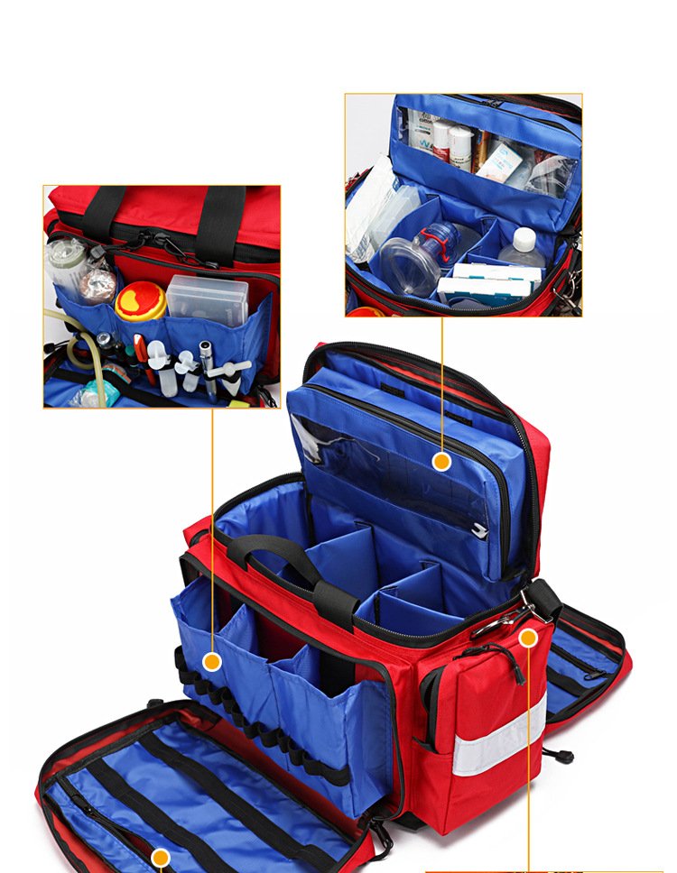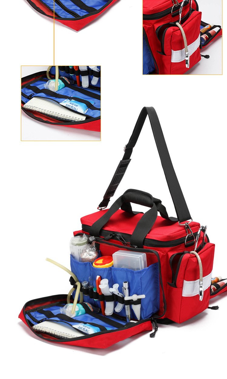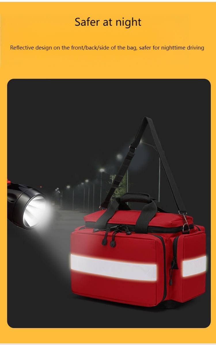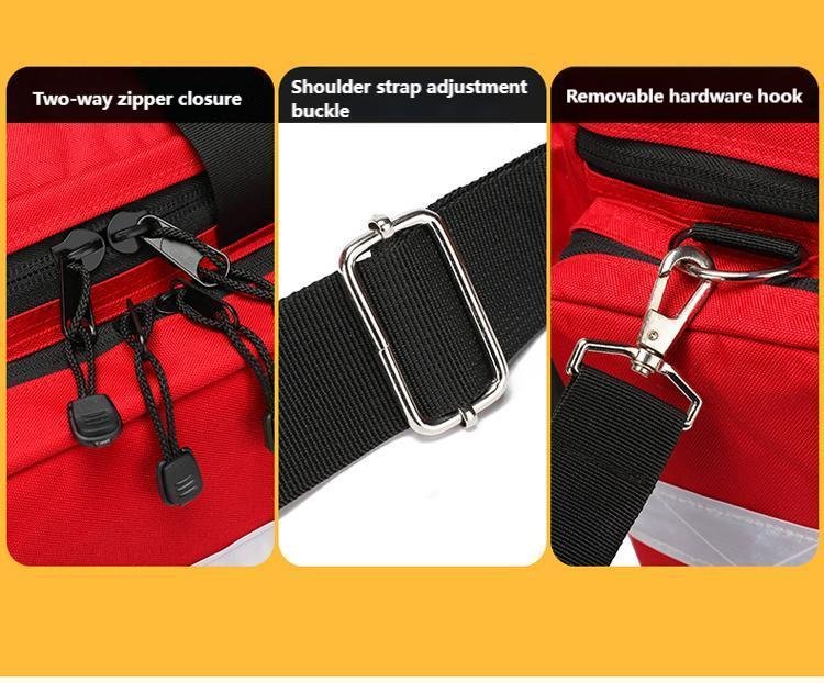 Model RH-GBS113 First Aid Bag is a professional-grade emergency medical kit designed for rapid response in critical situations. As shown in the image, this red first aid bag features a high-visibility design with reflective strips, durable fabric construction, and multiple zippered compartments for organized storage. Equipped with reinforced handles and an adjustable shoulder strap, it is easy to carry for ambulances, clinics, workplaces, outdoor rescue, and emergency responders. This portable first aid bag ensures quick access to medical supplies, making it an ideal solution for professional and emergency preparedness use.
