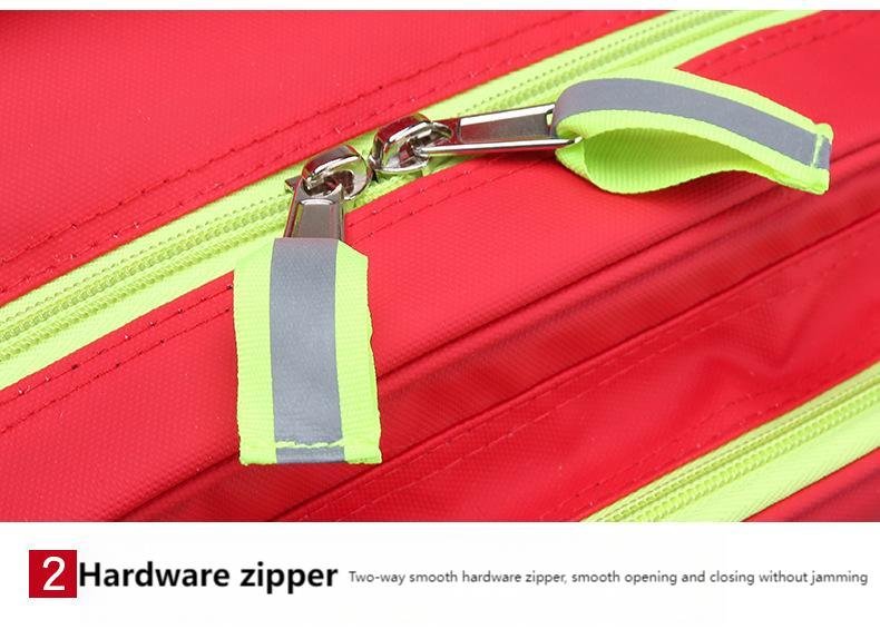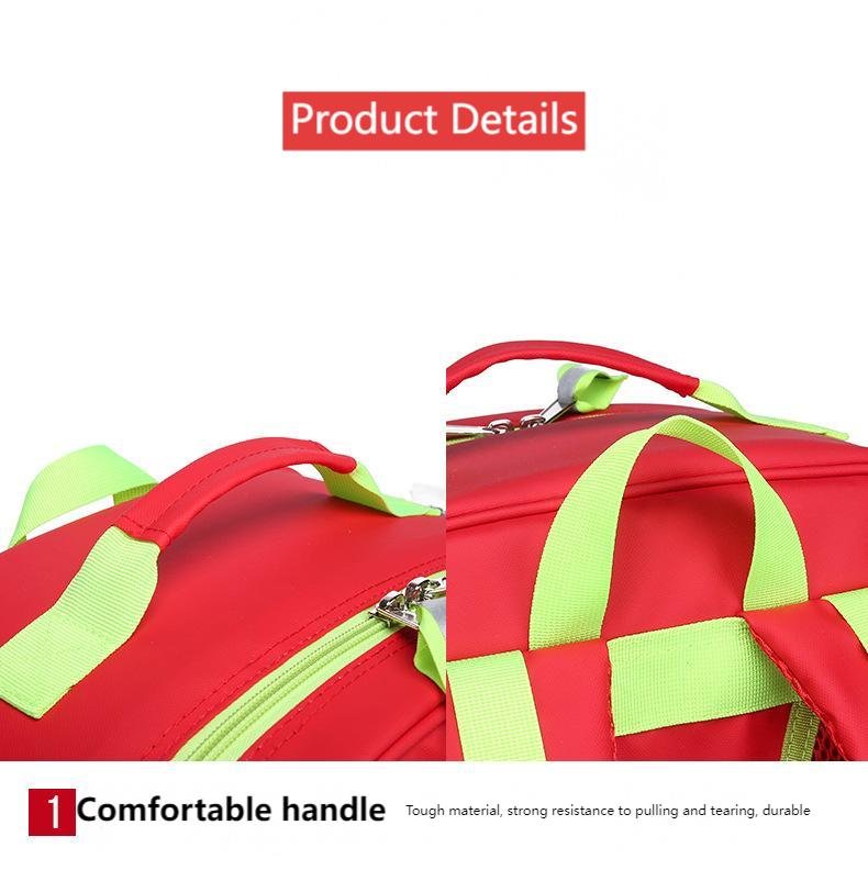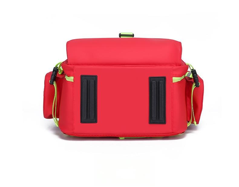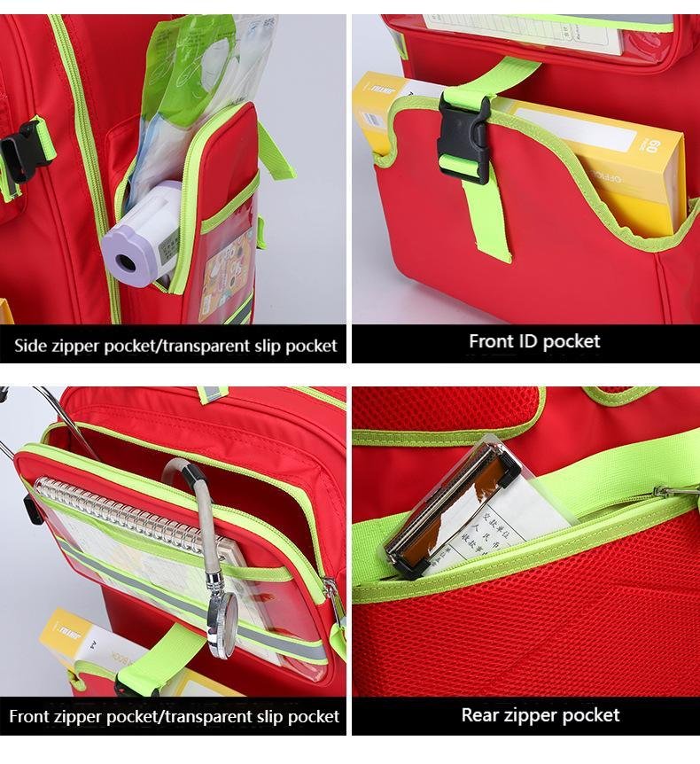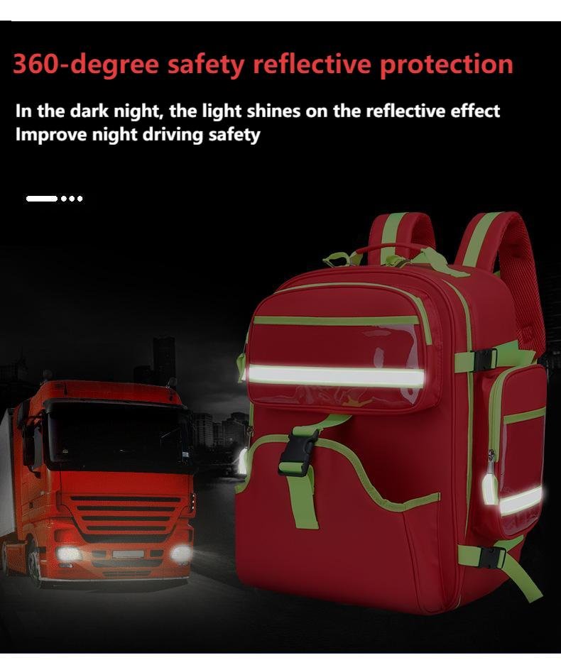 This compact red emergency backpack (50x37x20cm) organizes first aid supplies easily. It has high-visibility reflective strips, transparent pockets, and sturdy buckle straps for secure carry. Ideal for emergency kits or rescue gear.