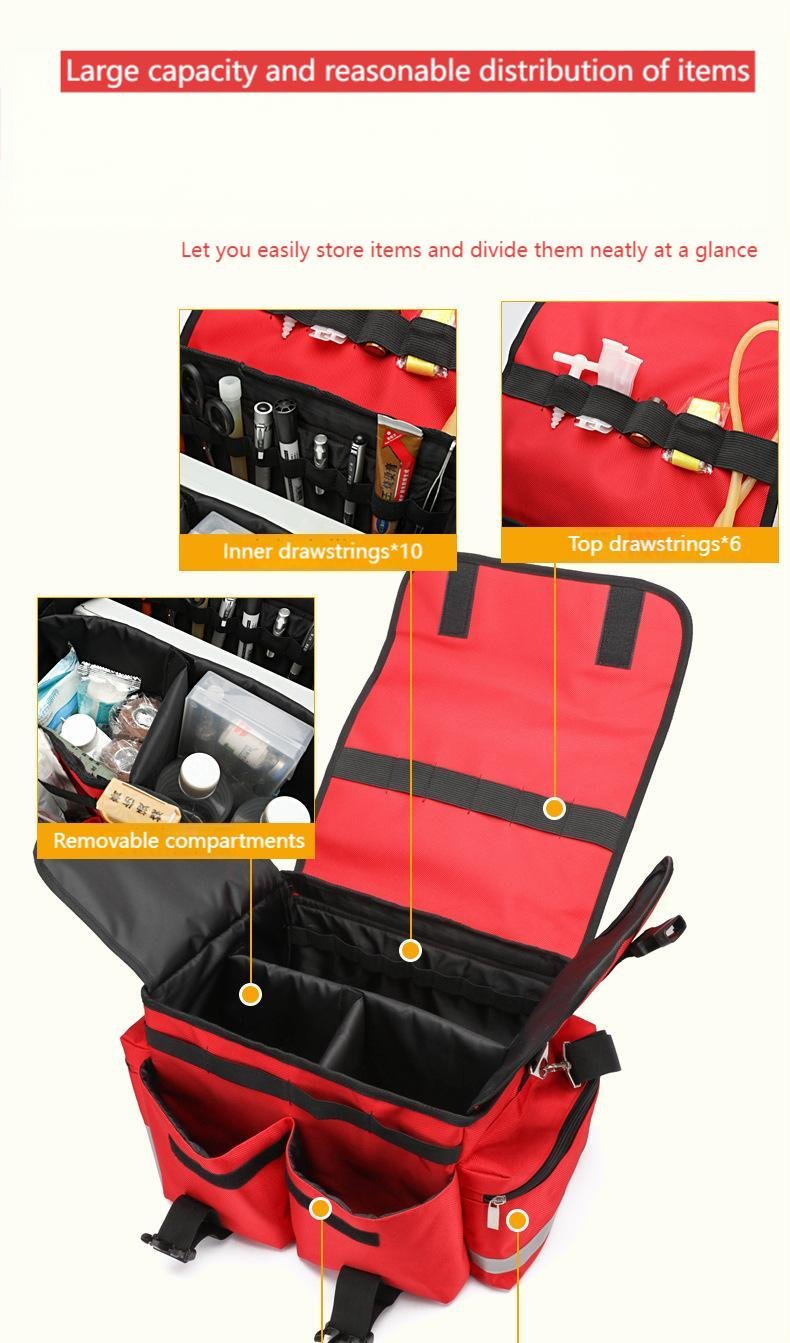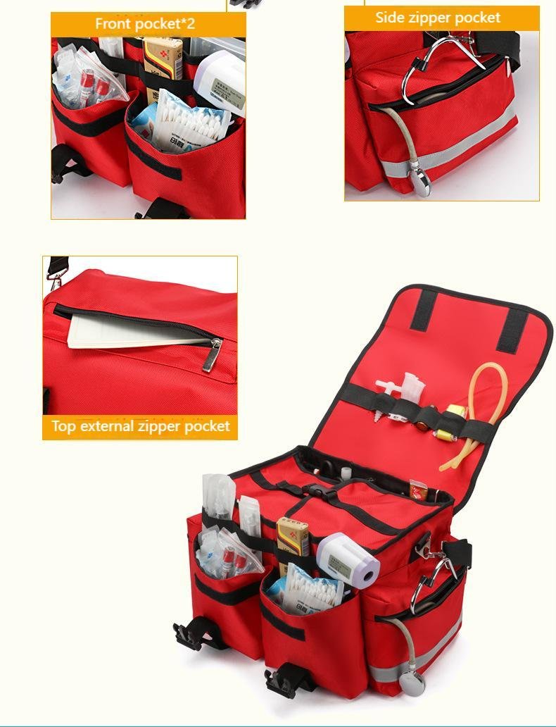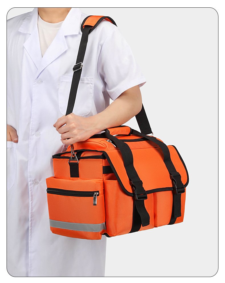 Model RH-GBS107 Ambulance First Aid Bag is a professional emergency medical bag designed specifically for ambulance and pre-hospital rescue use. Made from durable, heavy-duty fabric, this high-visibility first aid bag features multiple organized compartments for efficient storage and rapid access to essential medical supplies. With reinforced handles and an adjustable shoulder strap, it offers excellent portability for paramedics and emergency responders. Ideal for ambulances, hospitals, clinics, and emergency rescue teams, the RH-GBS107 emergency medical bag enhances response efficiency and supports reliable, professional emergency care.